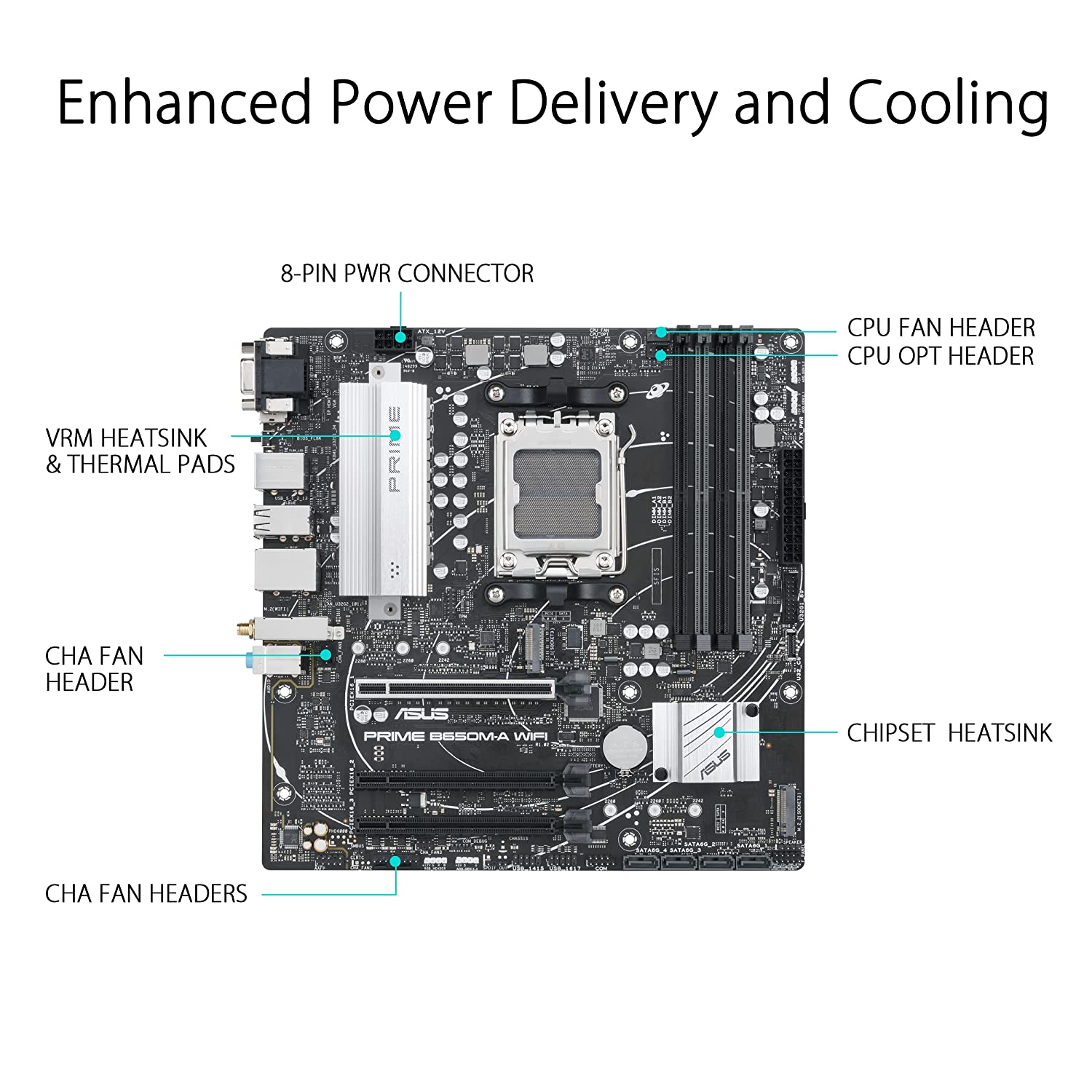 ASUS Prime series motherboards are expertly engineered to unleash the full potential of AMD Ryzen 7000-series processors. Boasting a robust power design, comprehensive cooling solutions and intelligent tuning options, PRIME B650M-A WIFI provides users and PC DIY builders with a range of performance optimizations.