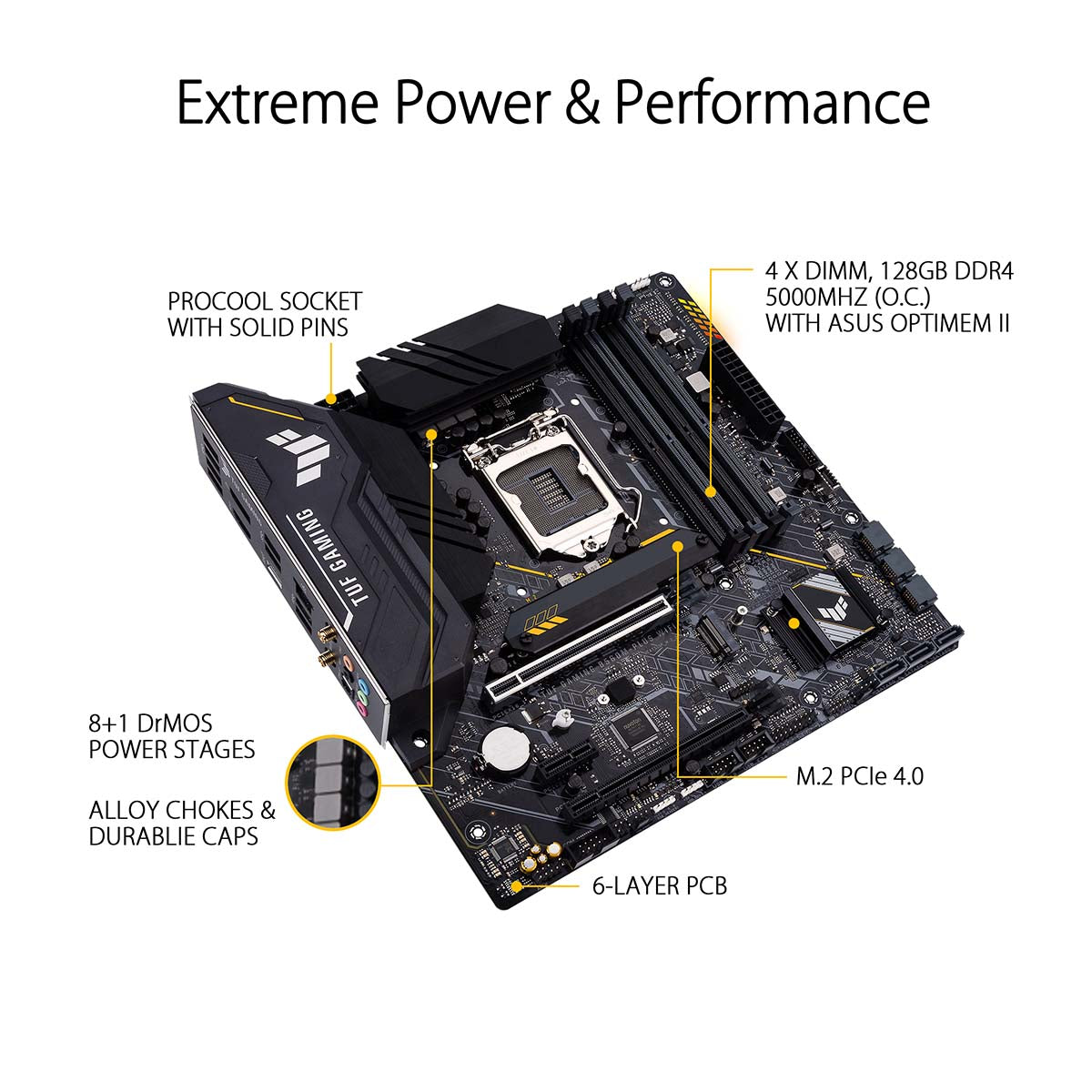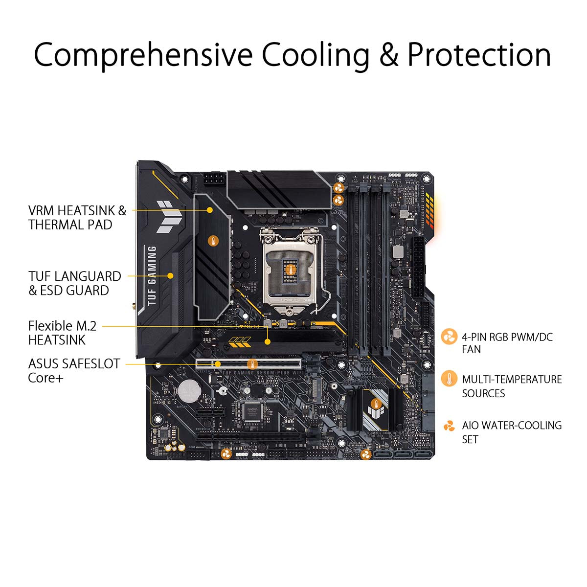 ASUS TUF GAMING B560M-PLUS WIFI takes all the essential elements of the latest Intel processors and combines them with game-ready features and proven durability. Engineered with military-grade components, an upgraded power solution and a comprehensive cooling system, this motherboard offers rock-solid, stable performance for marathon gaming.