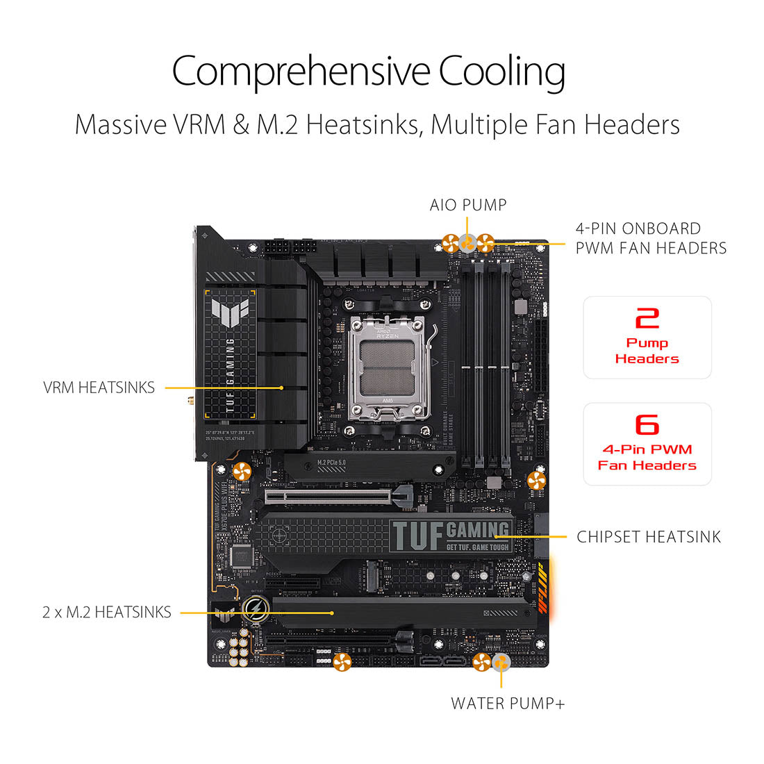 • TUF X670E motherboard is armed with a 3X enlarged VRM, PCH and three M.2 slots with heatsinks that provide the perfect balance of mass and surface area for heat dissipation.