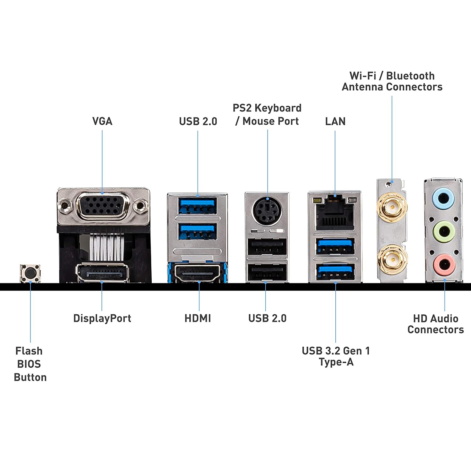 | Backpanel Ports | VGA USB 3.2 Gen 1 5Gbps Type-A Keyboard / Mouse LAN Flash BIOS Button DisplayPort HDMI USB 2.0 USB 3.2 Gen 1 5Gbps Type-A Wi-Fi Antenna connectors 3x Audio jacks |