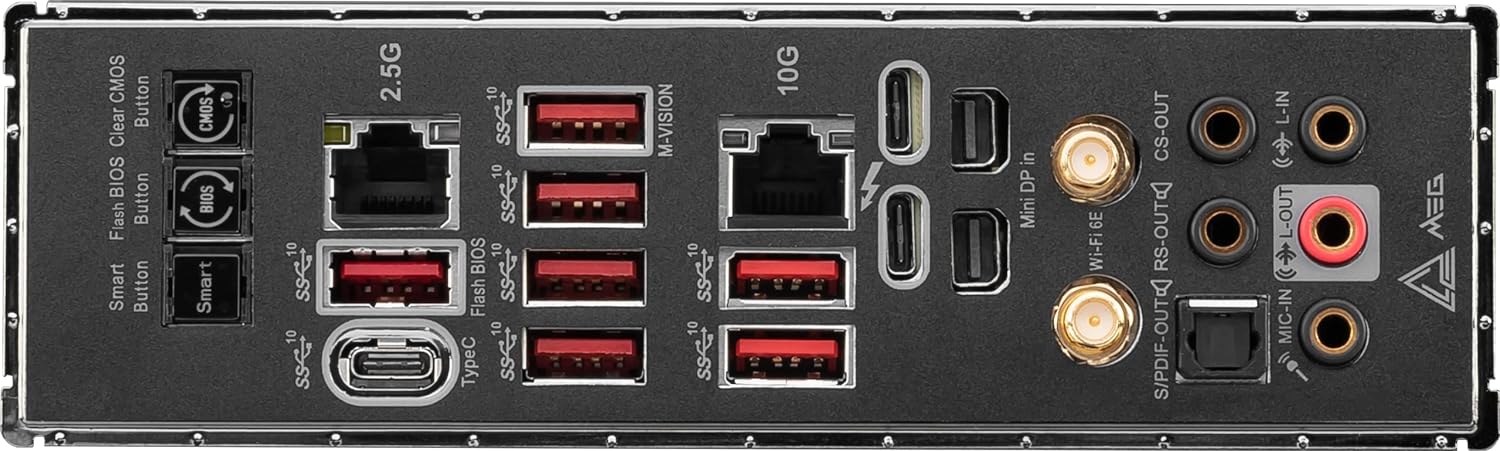 | BackPanel Ports | Clear CMOS Button Flash BIOS Button 2.5G LAN 10G Super LAN Thunderbolt 4 40Gbps (Type-C) Wi-Fi / Bluetooth Audio Connectors Smart Button USB 3.2 Gen 2 10Gbps (Type-C) USB 3.2 Gen 2 10Gbps (Type-A) Mini DisplayPort Input (for Thunderbolt passthrough) Optical S/PDIF-Out |